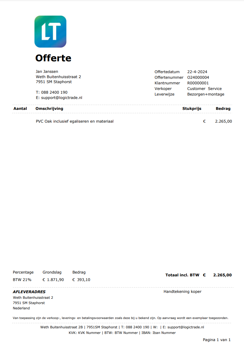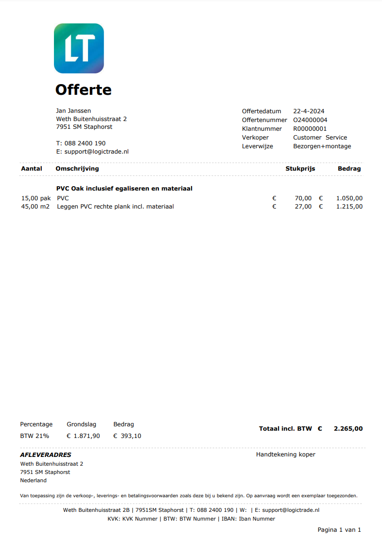 Als bij de vraag "Alleen kop van offerteregelgroep tonen" het antwoord niet wordt aangepast, wordt de offerte getoond zoals in voorbeeld 2.