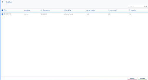 Stap 3: Je komt nu in het besteloverzicht waar je los van elkaar de verkooppregels kunt aanvinken om te bestellen. Klik vervolgens op genereer rechts onderin het scherm.