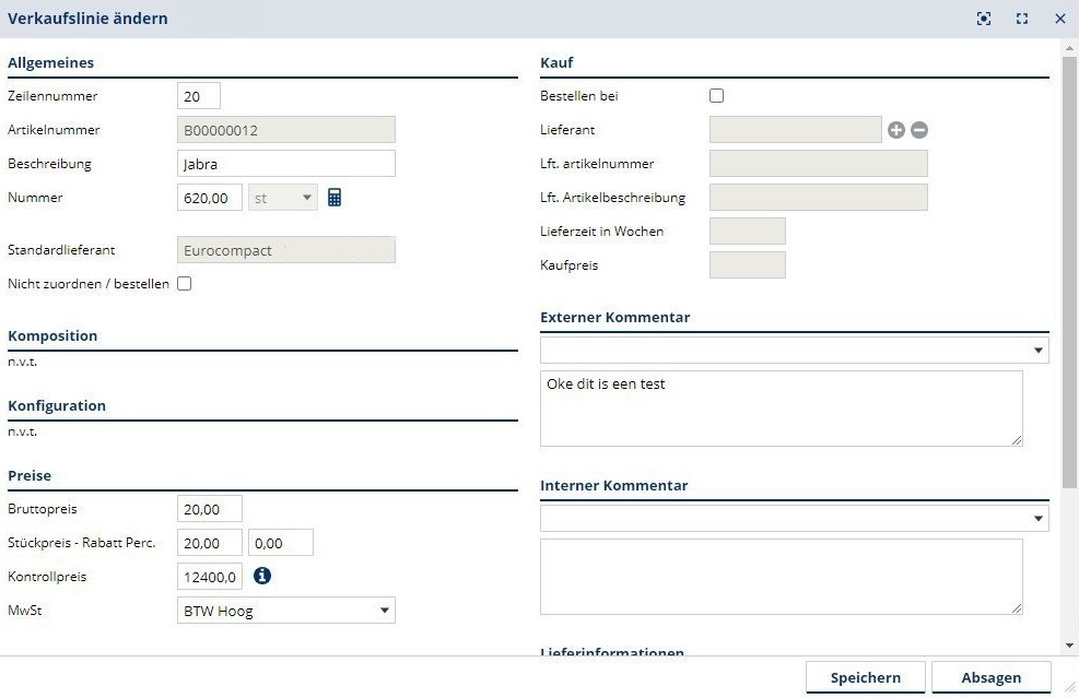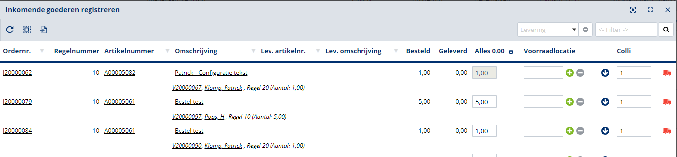 Bij het binnenmelden van goederen kan nu ook aangegeven worden hoeveel colli dit zijn. Onderstaand een screenshot van het scherm Logistiek: Inkomende goederen registreren. Als laatste kolom is toegevoegd het aantal colli. Standaard staat deze op 1.