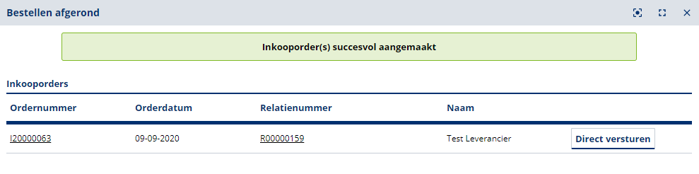 Er is nu een nieuwe inkooporder aangemaakt. Deze inkooporder kan direct verstuurd worden naar de desbetreffende leverancier. Kies hiervoor de knop Direct Versturen. (Let op: Als er gebruik wordt gemaakt van "Direct versturen" wordt de inkooporder nog niet meteen verzonden)