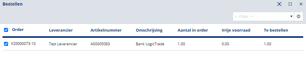 Hier zijn alle verkooporderregels te zien die besteld moeten worden. Er is een mogelijkheid om niet de gehele order in één keer te bestellen. Dit is te regelen door de blauwe vinkjes aan/uit te zetten.