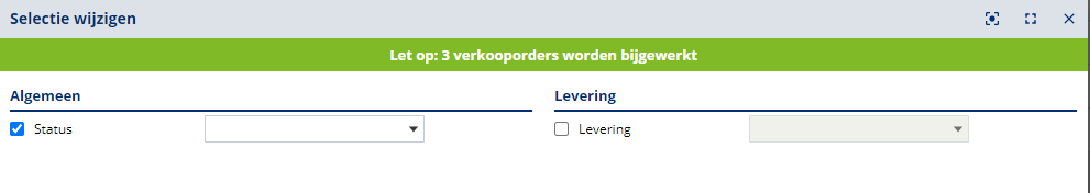 De status en de levering van meerdere orders kan nu tegelijkertijd gewijzigd worden. Dit werkt hetzelfde als bij artikelen. Selecteer meerdere orders tegelijk, klik met de rechtermuisknop op deze orders en kies dan Wijzig: Selectie. Onderstaande scherm verschijnt. Hier kan de status gewijzigd worden en/of de levering.