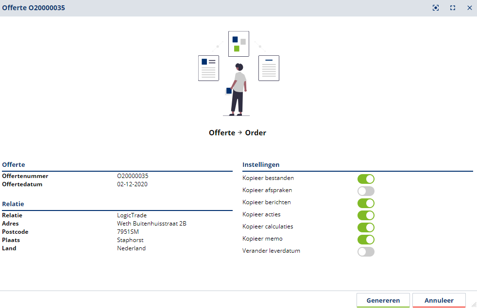 Het scherm om een order te genereren van een offerte is gewijzigd. Gegevens zijn inzichtelijk en de instellingen zijn op dat moment eenvoudig te wijzigen.