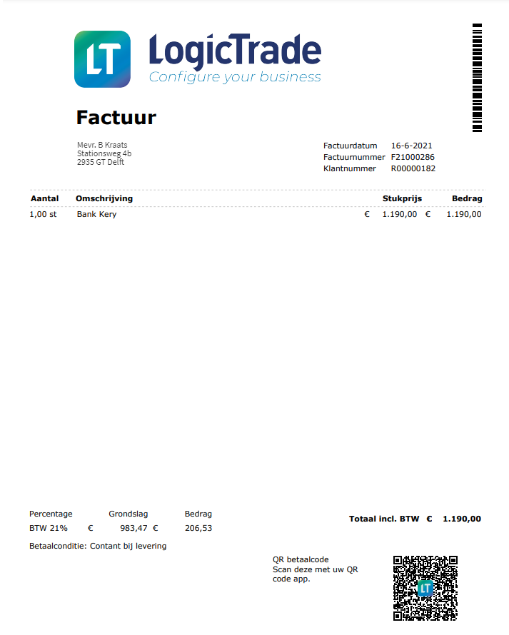U kunt de betaallink ook in de vorm van een QR-code op uw factuur publiceren. De klant kan eenvoudig de QR-code scannen en de betaling voldoen. De QR-code is alleen beschikbaar op de standaard layout. Wanneer u voor juni een kopie heeft gemaakt van de factuur, wordt de QR-code niet op de factuur gepubliceerd. U kunt de QR-code zelf toevoegen aan uw factuur door gebruik te maken van de reportedesigner.