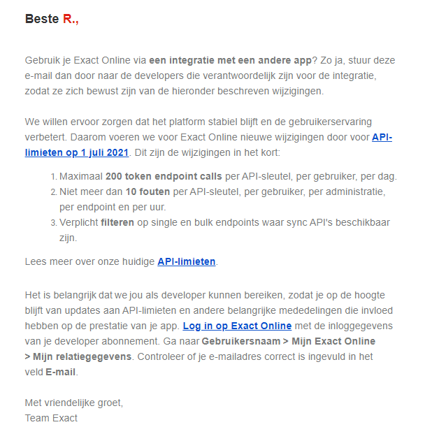 De Exact Online koppeling is aangepast en de API-aanroepen zijn verminderd, waardoor het limiet niet meer wordt overschreden. Deze wijziging is gedaan naar aanleiding van het onderstaande bericht van Exact Online.