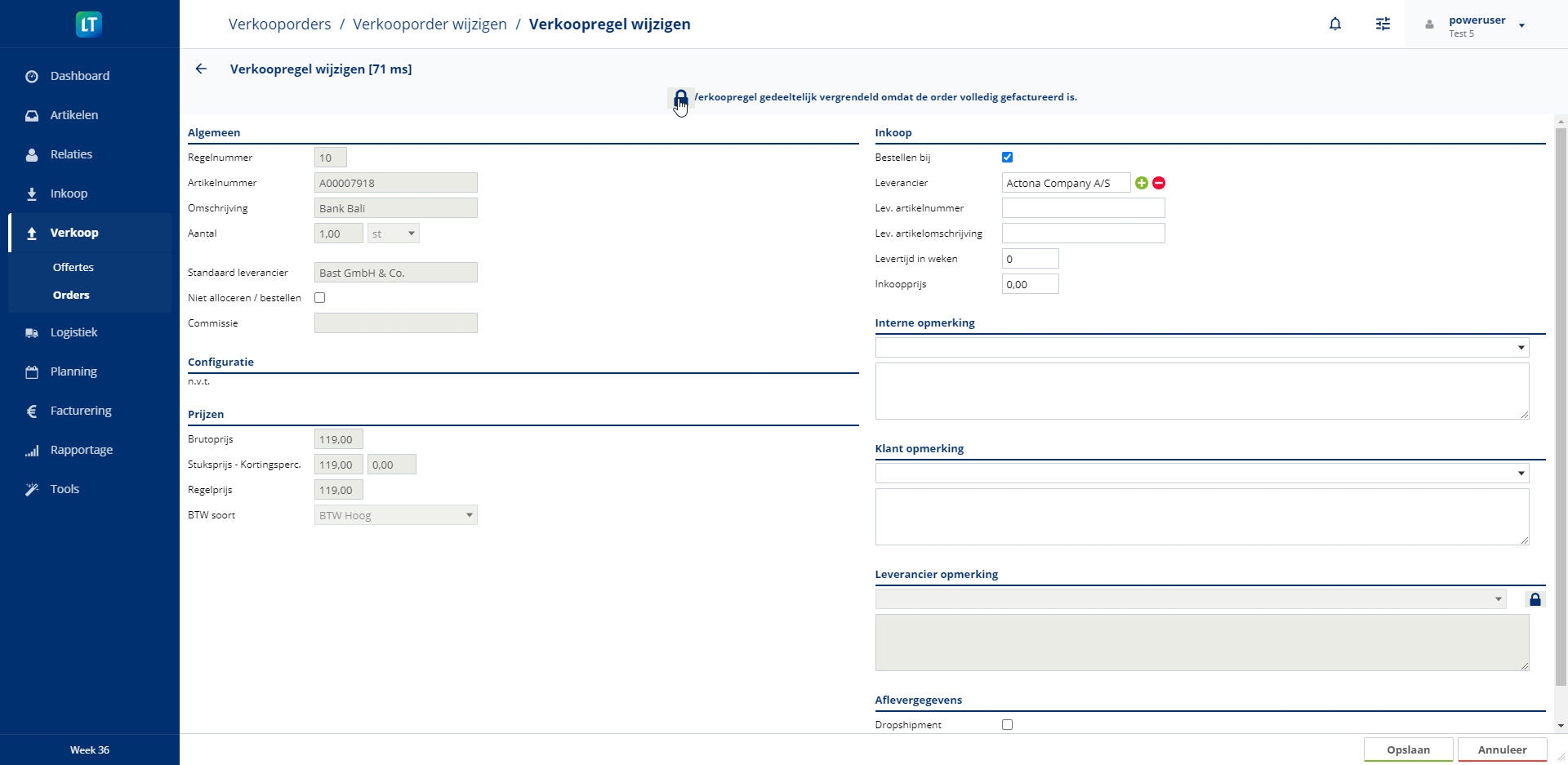 Het is nu mogelijk om de verkooporder te vergrendelen, nadat deze gefactureerd is. Dit is alleen mogelijk als u over de juiste rechten beschikt. U kunt door middel van een instelling aangeven tot in hoeverre de verkooporder aangepast mag worden. Er zijn 3 type instellingen aangemaakt, deze bepalen tot in hoeverre u de order aan kunt passen.