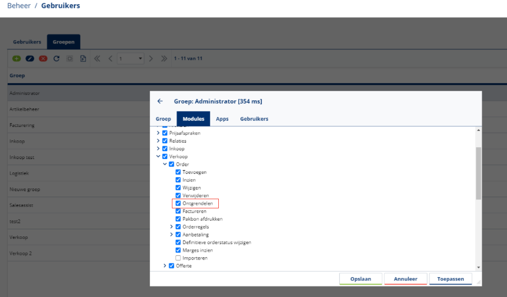 U kunt per gebruikersgroep instellen welke gebruikers het recht hebben om de verkooporder aan te passen. Als u het recht 'ontgrendelen' aankruist heeft deze gebruikersgroep het recht om de verkooporder aan te passen, nadat deze gefactureerd is.