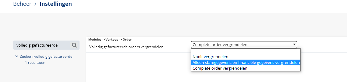 Deze instelling staat standaard op 'niet vergrendelen', tenzij u de licentie optie 'volledig gefactureerde orders mogen niet gewijzigd worden' aan had staan. Als u deze licentie aan had staan staat de standaard op 'alleen stamgegevens en financiële gegevens vergrendelen'.