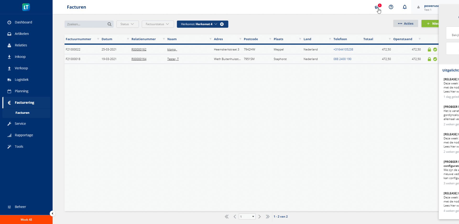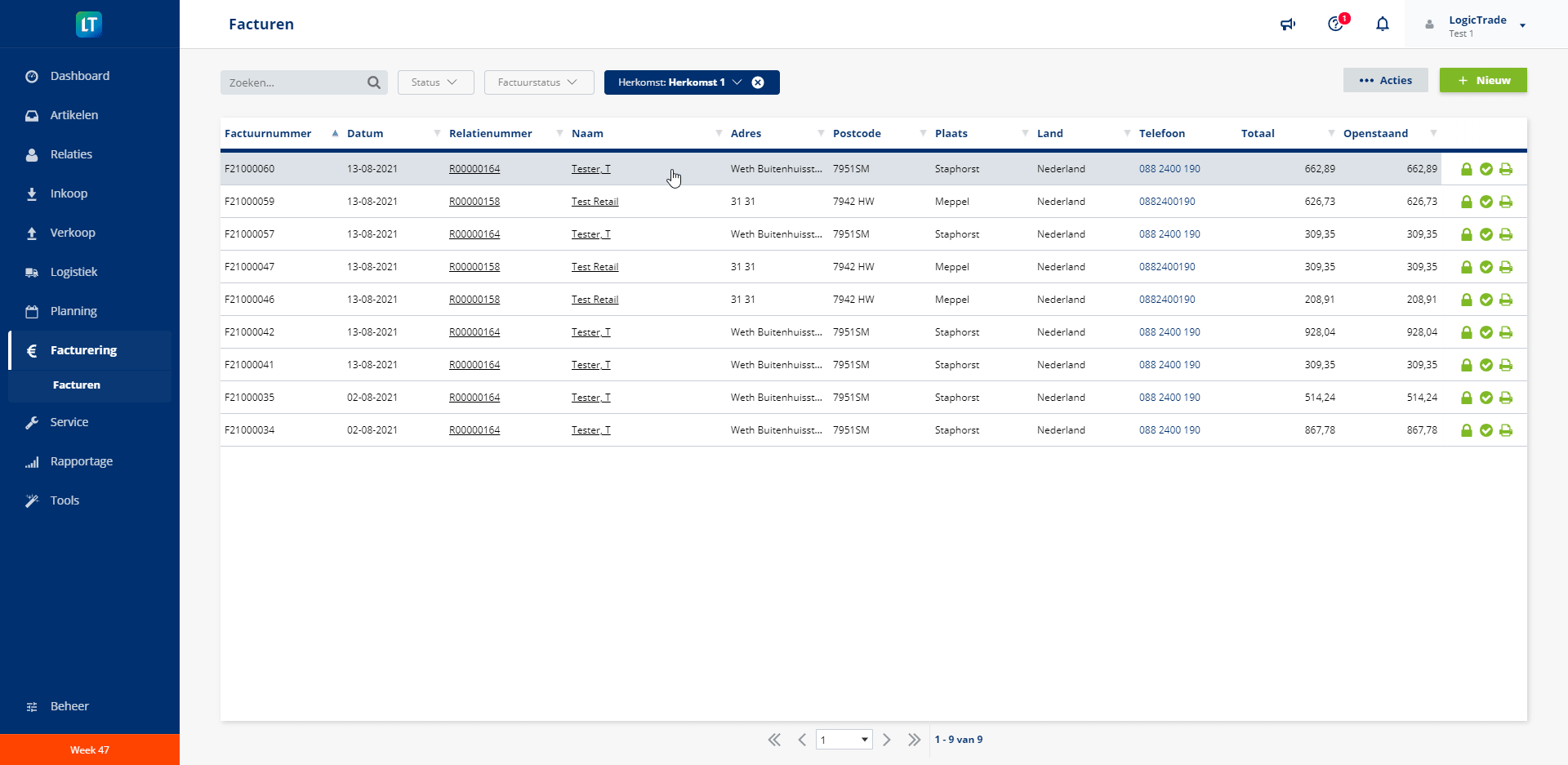 Het is na deze update wel mogelijk om een termijnfactuur te crediteren in LogicTrade. Als u een termijnfactuur heeft aangemaakt die u wilt crediteren, gaat u naar de module 'Facturering'. U klikt met uw rechtermuisknop op de factuur en klikt op 'Crediteren'. U ziet dat LogicTrade nu een credit factuur heeft aangemaakt van deze termijnfactuur.