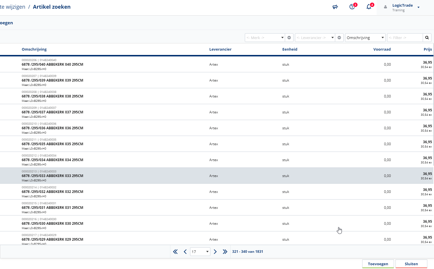 Het is nu mogelijk om de Artex collectie in jouw LogicTrade omgeving te importeren. De voordelen hiervan zijn dat de prijzen automatisch worden ingelezen en bijgewerkt. Ook zijn de kenmerken welke nodig zijn voor het confectioneren van het gordijn beschikbaar voor de LogicTrade Gordijn calculator en de Vadain gordijn calculator. Tijdens het confectioneren hoef je dan geen kenmerken in te geven om te starten met de configuratie.