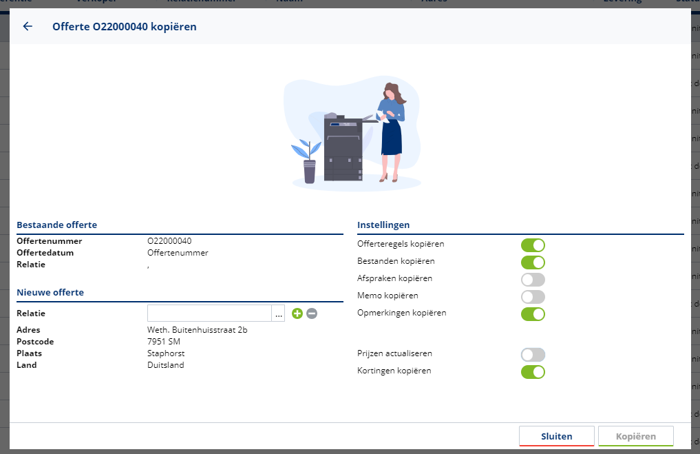 Wanneer je een order of offerte gaat kopiëren, worden de prijzen niet meer automatisch bijgewerkt. Het automatisch bijwerken van prijzen ging niet goed met diverse artikelen, omdat deze artikelen een verkoopprijs van 0 euro hebben. Wil je de prijzen, afspraken of memo wel kopiëren naar een nieuwe offerte of order, dan kan je het schuifje naar rechts slepen.