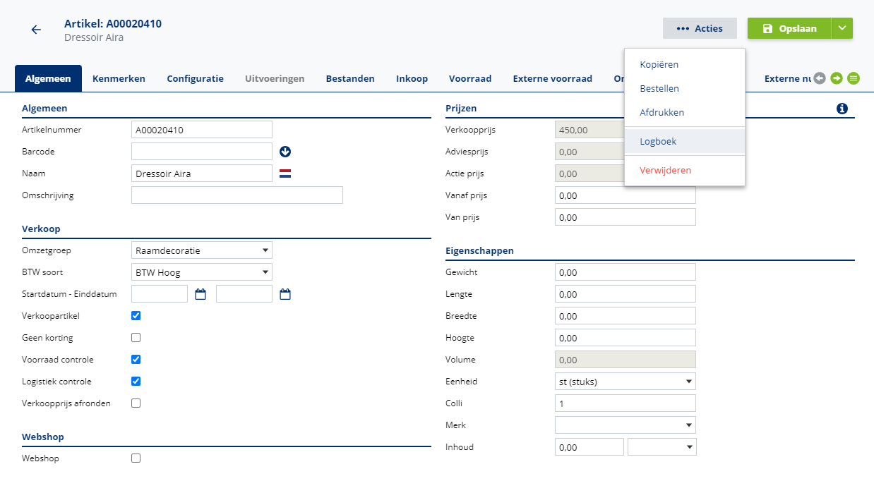 Je kan het logboek van een artikel nu ook inzien als je het artikel opent. Voorheen was het logboek alleen te benaderen vanuit het artikeloverzicht. Je kan het logboek nu ook openen vanuit het artikel door op acties --> logboek te klikken.