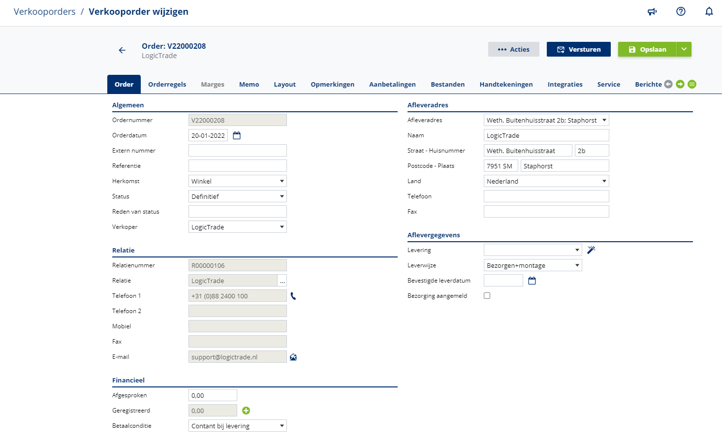 U kunt een levering op verschillende manieren aanmaken. Bijvoorbeeld via het orderoverzicht rechtermuisknop op de order --> levering uitleveren of door de order te openen en dan acties --> levering. Als u op 'levering --> uitleveren' klikt kunt u de levering uitleveren. Lees hier meer over de werking en voordelen van de nieuwe manier van leveren.