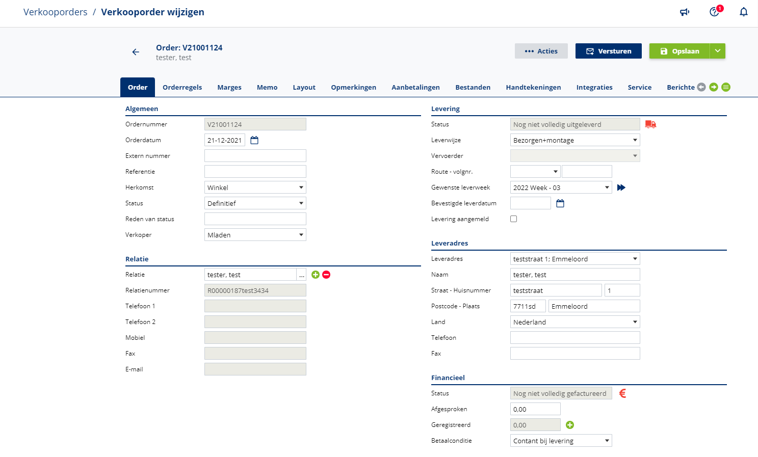 Er zijn enkele wijzigingen doorgevoerd in het order detail scherm. De wijzigingen hebben voornamelijk plaats gevonden aan de rechterzijde van het order detailscherm. U ziet nu een kopje 'leveringen' staan, hier ziet u de status, leverwijze, vervoerde, route - volg nr, gewenste leverweek, bevestigde leverdatum en levering aangemeld staan. Voorheen was de informatie over de levering in het order details scherm beperkt en kon u alleen de levering, leverwijze, bevestigde leverdatum en bezorging aangemeld zien. Het kopje levering geeft u een completer beeld van de levering. Een mooie aanvulling is het vrachtwagen icoon, dit icoon zal u vast bekent voorkomen. Deze vrachtwagen geeft de status van de order aan, voorheen was dit niet zichtbaar in het order details scherm. U kunt nu ook in één oogopslag de financiële status zien van de order, voorheen was dit niet zichtbaar in dit scherm. Hieronder kunt u de verschillen zien.