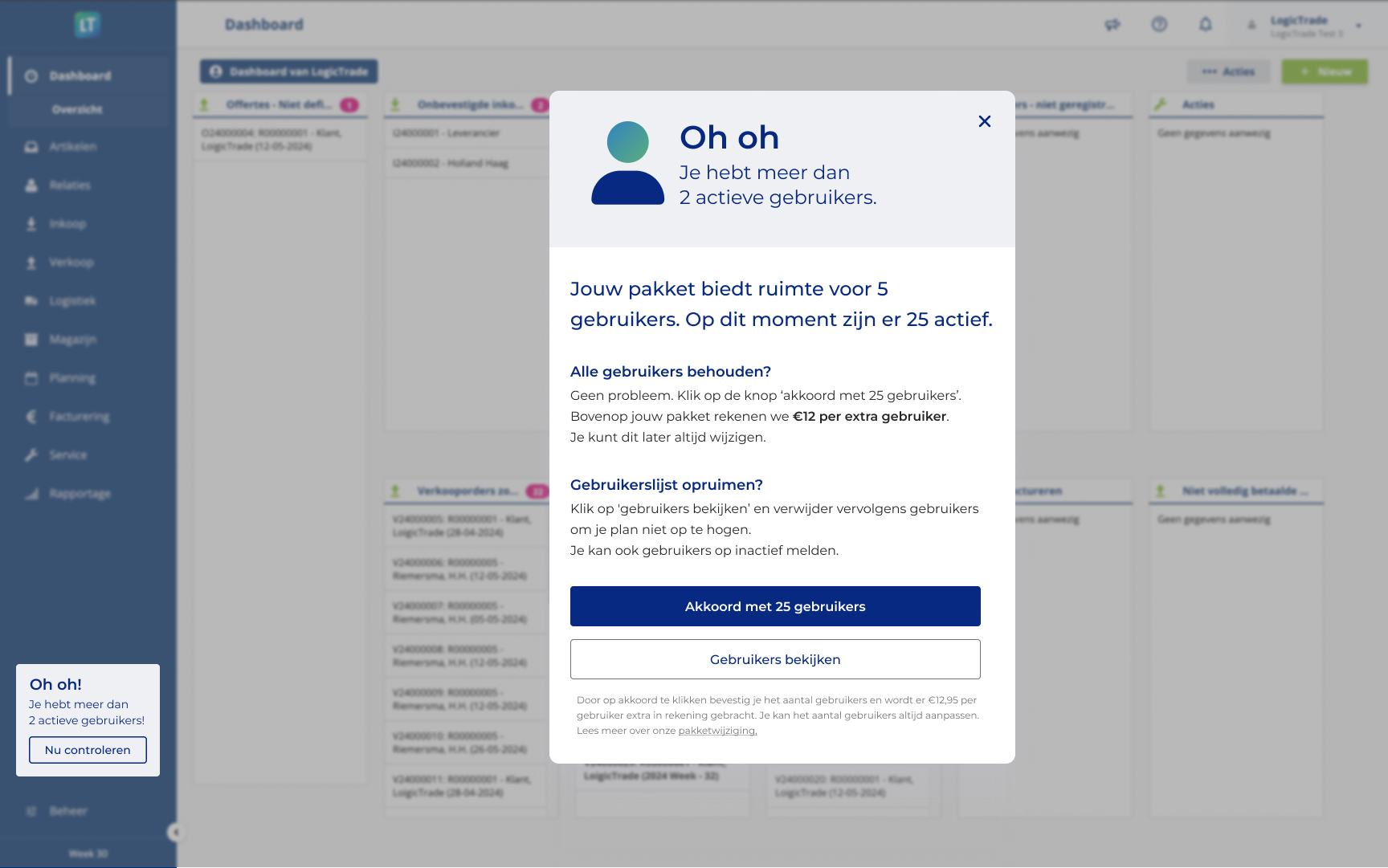 Het zou kunnen zijn dat je een melding in LogicTrade krijgt om te controleren of je geregistreerde gebruikers nog actief zijn en of je akkoord bent met het aantal gebruikers. Alleen gebruikers met de rechten om gebruikers te beheren, krijgen deze melding te zien en kunnen deze accepteren of aanpassen.