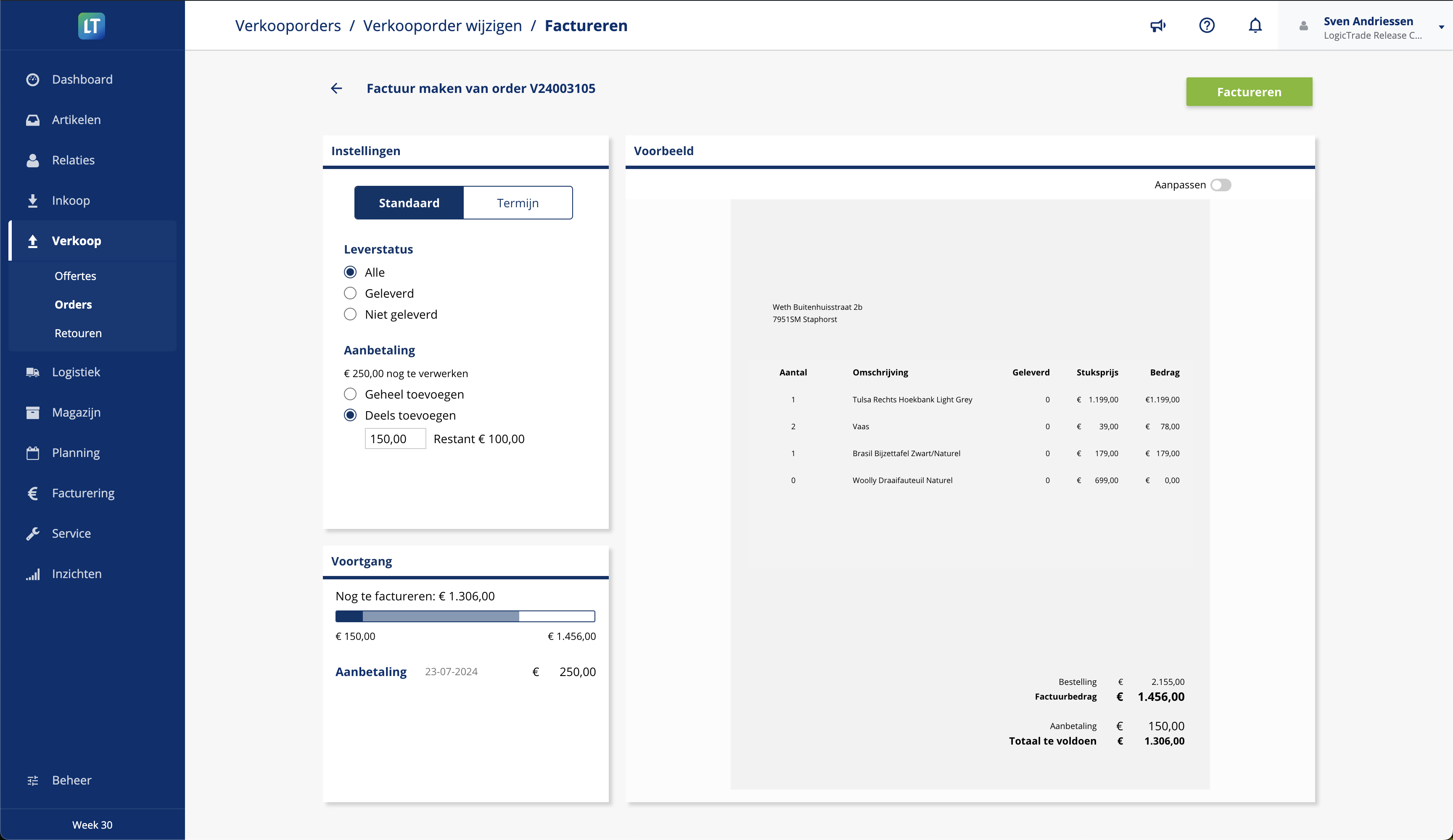 De factuur module is compleet vernieuwd. De grootste zichtbare verandering is dat het nu veel beter te zien is hoe een factuur van een verkooporder gemaakt gaat worden door een goede voorvertoning te weergeven tijdens het factureren. Op deze manier heb je zelf alle controle en zie je wat het systeem voor je gaat doen.