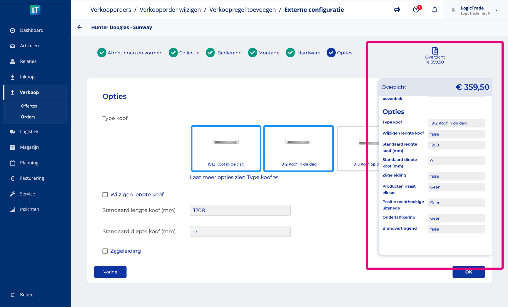 3. Houd met een handig overzicht alle confectie opties en de totale prijs bij.