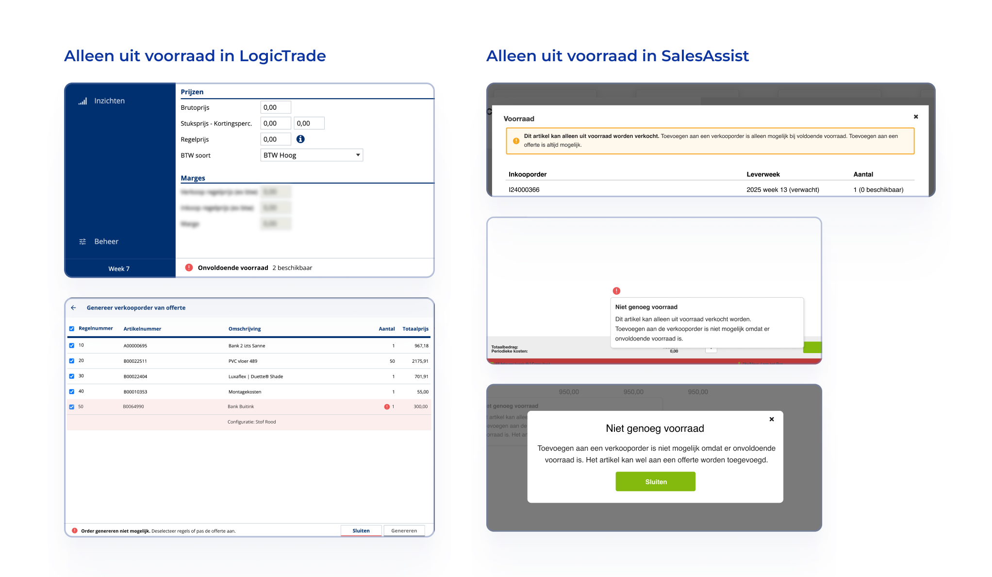 De nieuwe instelling is zichtbaar in zowel LogicTrade als de SalesAssist. In beide omgevingen mag een artikel dat is ingesteld op alleen uit voorraad gewoon op een offerte worden geplaatst. We tonen het wel al bij een offerte wanneer het artikel niet te bestellen is, maar je kan verder gewoon met de offerte werken. Pas bij het omzetten van de offerte naar een verkooporder controleert het systeem strikt op beschikbaarheid. Is er geen voorraad of openstaande inkooporder, dan verschijnt een foutmelding en wordt de order geblokkeerd.