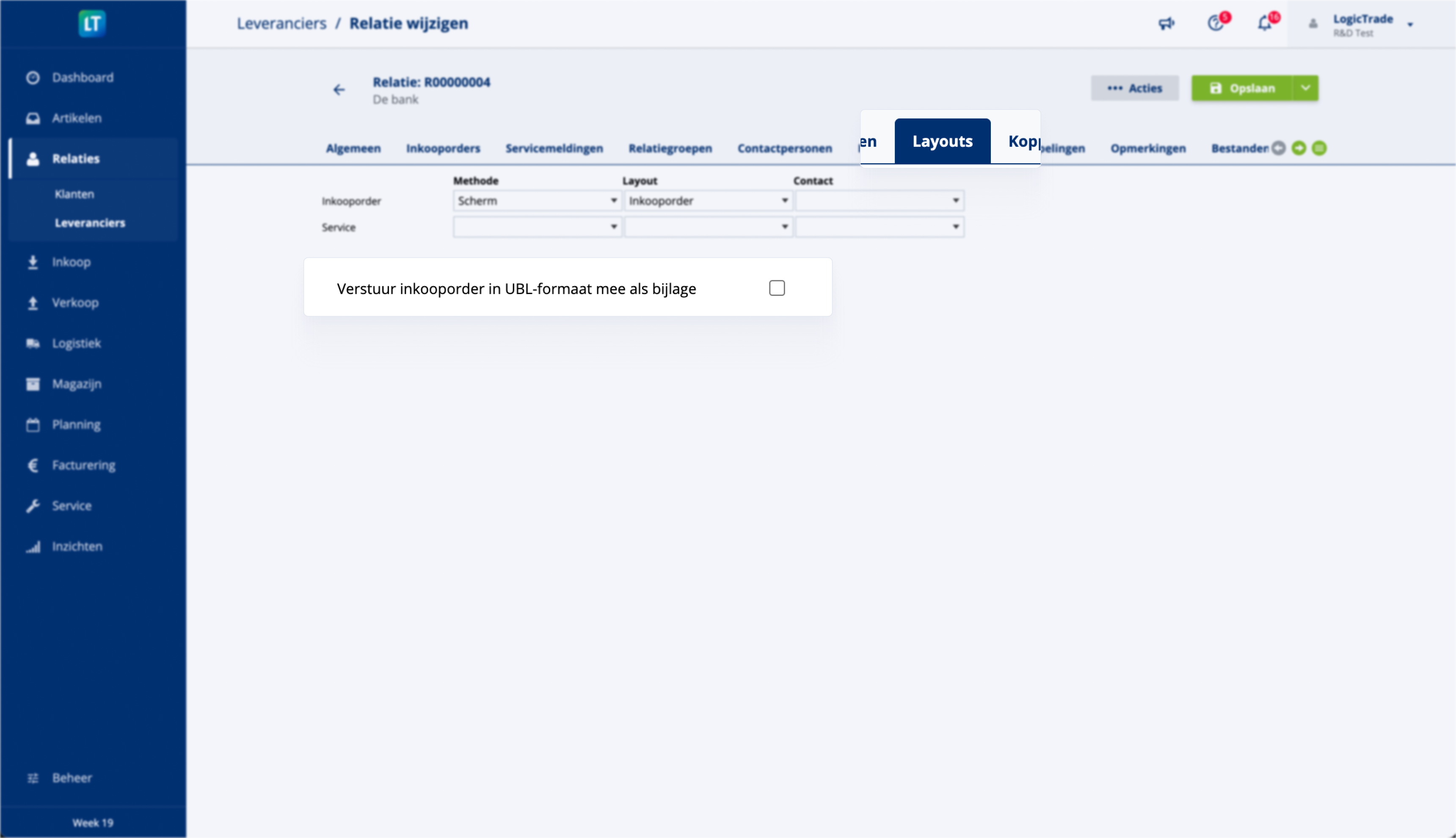 Om de UBL-functionaliteit te activeren, zet je eenmalig de optie aan in de relatie-instellingen, onder het tabblad “Layouts”. Zodra deze instelling is ingeschakeld, wordt bij iedere inkooporder naar die leverancier een UBL-bestand als bijlage meegestuurd via de ordermail.
