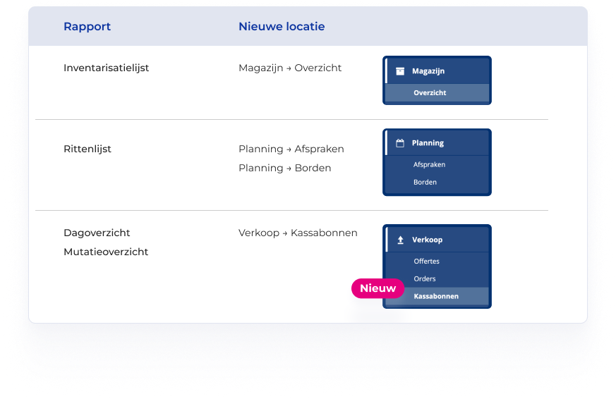 De oude rapportagepagina is verwijderd. De belangrijkste rapporten zijn verplaatst naar logische plekken je administratie: