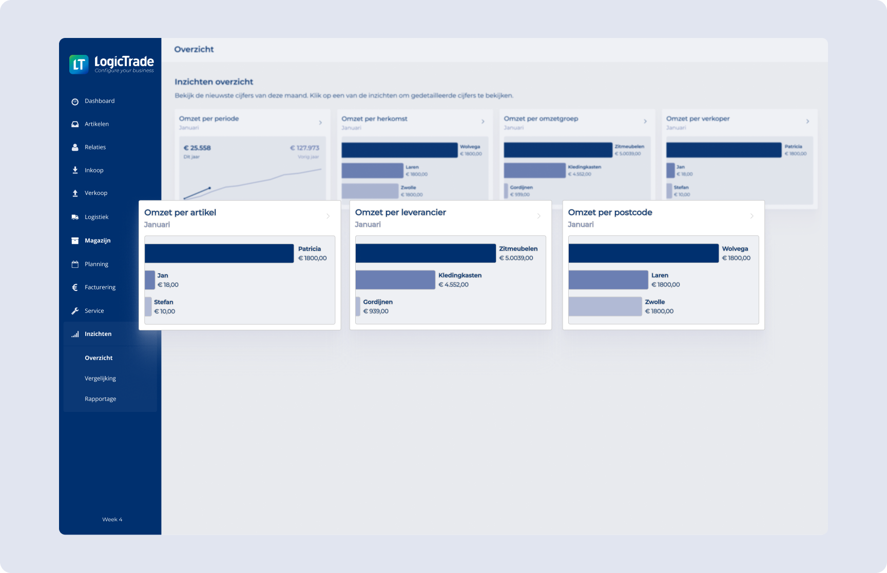 Op de hoofdpagina zie je nu ook de top 3 artikelen, leveranciers en postcodes van deze maand. Klik je door, dan krijg je uitgebreide grafieken, tabellen en filters, zodat je precies ziet waar je omzet vandaan komt.