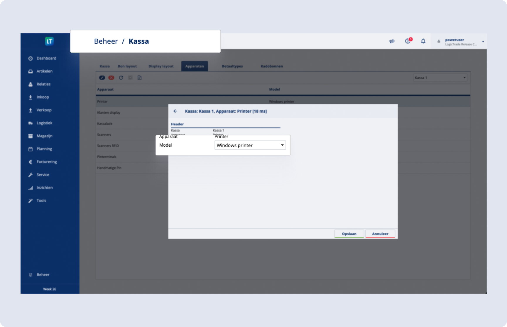 Omdat je LogicTrade omgeving in de cloud draait, kan deze geen lokale printers herkennen. Je kiest de printer dus altijd op de kassa zelf. Wordt er geen printer gevonden, dan krijg je een duidelijke foutmelding zodat je weet wat er aan de hand is.