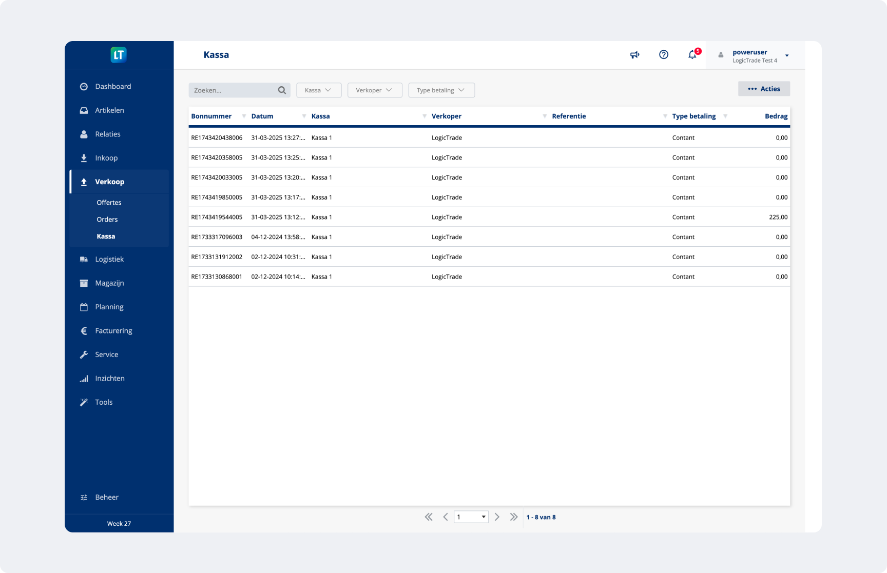Er is een nieuwe pagina toegevoegd onder Verkoop > Kassabonnen. Hier vind je een duidelijk overzicht van alle kassabonnen, inclusief het dag- en mutatieoverzicht. Je kunt vanuit deze pagina ook direct bonnen afdrukken. Alles wat je nodig hebt, overzichtelijk bij elkaar.
