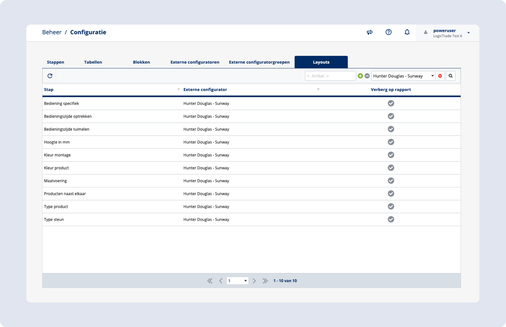 Via Beheer > Configuratoren > Layouts open je een nieuw scherm met een overzicht van alle configuratiestappen. Hier vink je eenvoudig aan wat wel of niet getoond mag worden. Je kunt filteren op artikel of op configurator, zodat je snel vindt wat je zoekt.