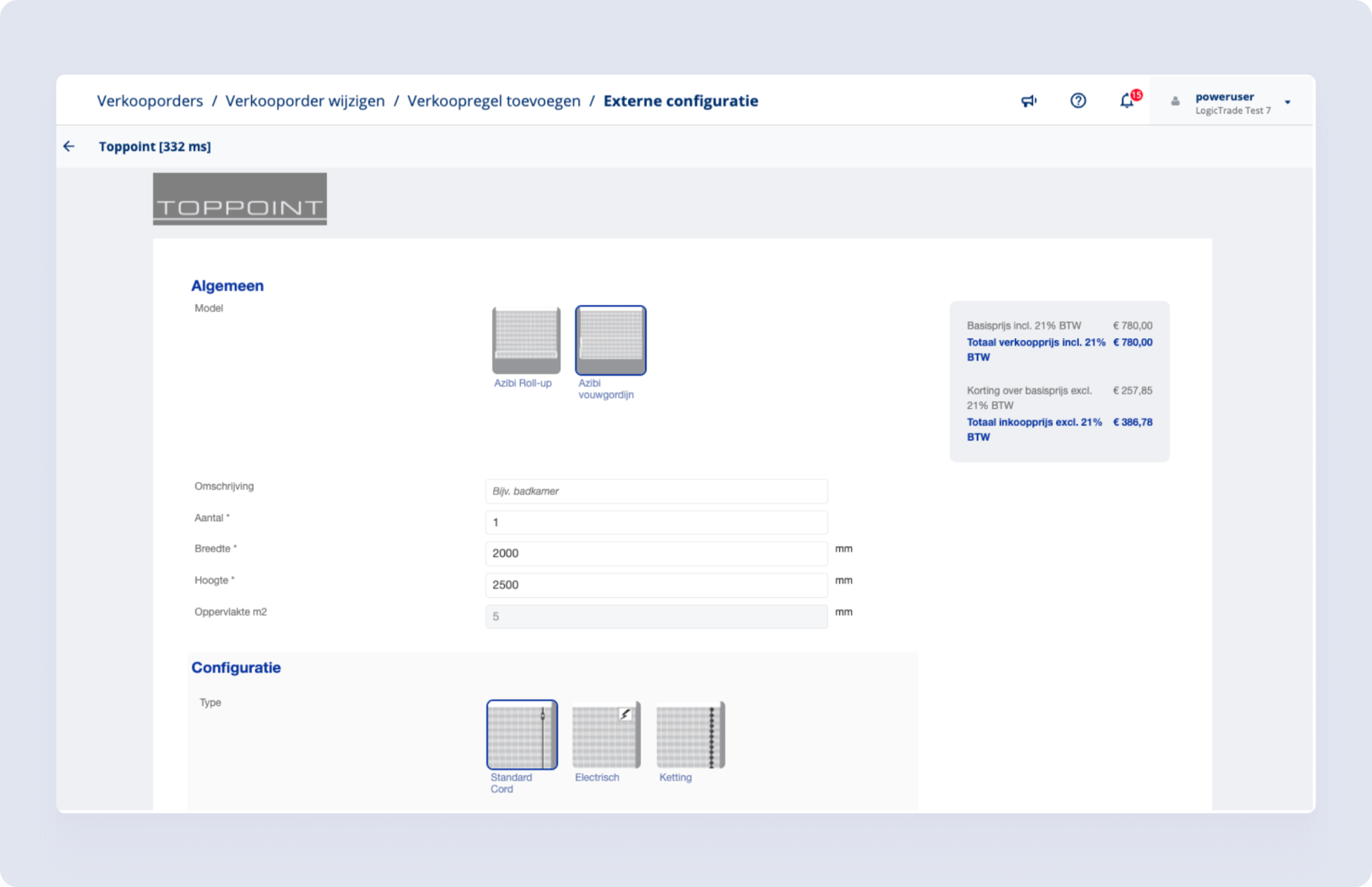 De nieuwe configurator voor Toppoint raamdecoratie is vanaf nu beschikbaar in LogicTrade. Je kunt hiermee direct vanuit een verkooporder artikelen configureren en bestellen, zonder extra handmatige stappen.