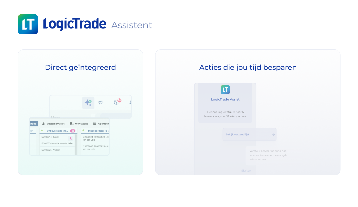 Met LT Assist helpt je sneller door je taken heen. De assistent begrijpt waar je bent in de LogicTrade en helpt vanuit die context, bijvoorbeeld door mee te denken over onbevestigde inkooporders en het voorbereiden van een e-mail aan leveranciers.