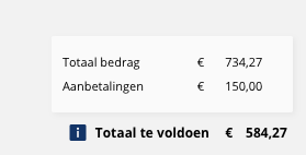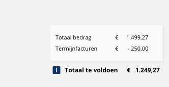 Indien van toepassing wordt er een i-knop getoond. Als je hierop klikt, krijg je aanvullende informatie te zien, bijvoorbeeld over een termijnfactuur die verrekend gaat worden op de factuur. TermijnfactuurAanbetaling