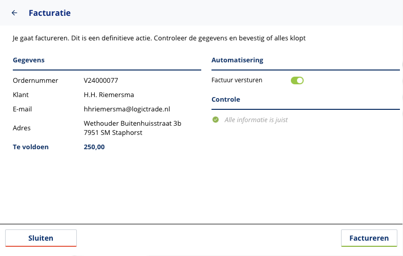 Factuur versturen “aan”: Als je op de knop Factureren klikt, word er een factuurnummer aangemaakt. Het factuur versturen-scherm opent op een nieuw tabblad waarna de gebruiker de factuur kan versturen en/of uitprinten.