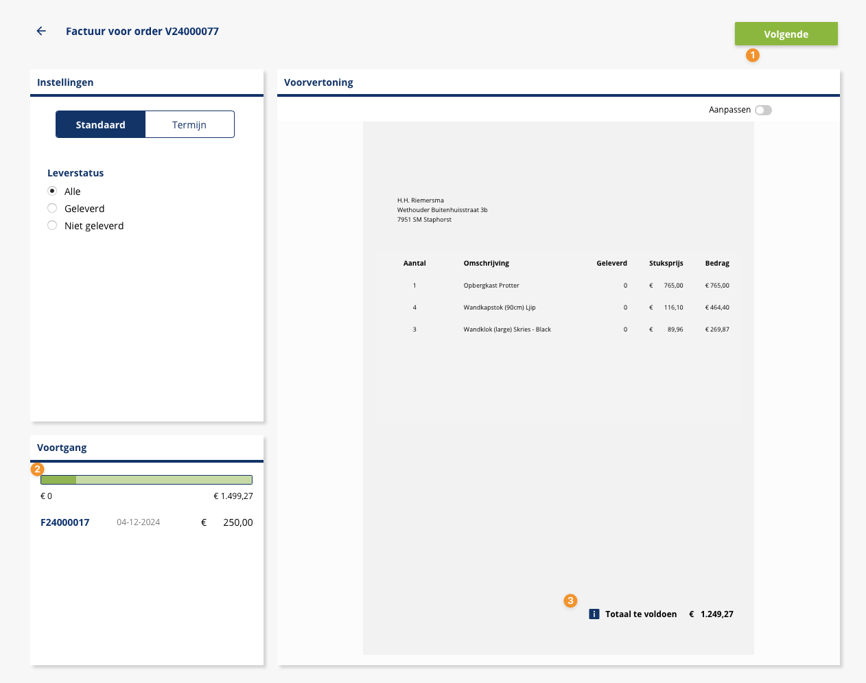 Factuur versturen “uit”: Factuur heeft nog géén factuurnummer. Je vindt de factuur bij de andere facturen van deze order om later te versturen