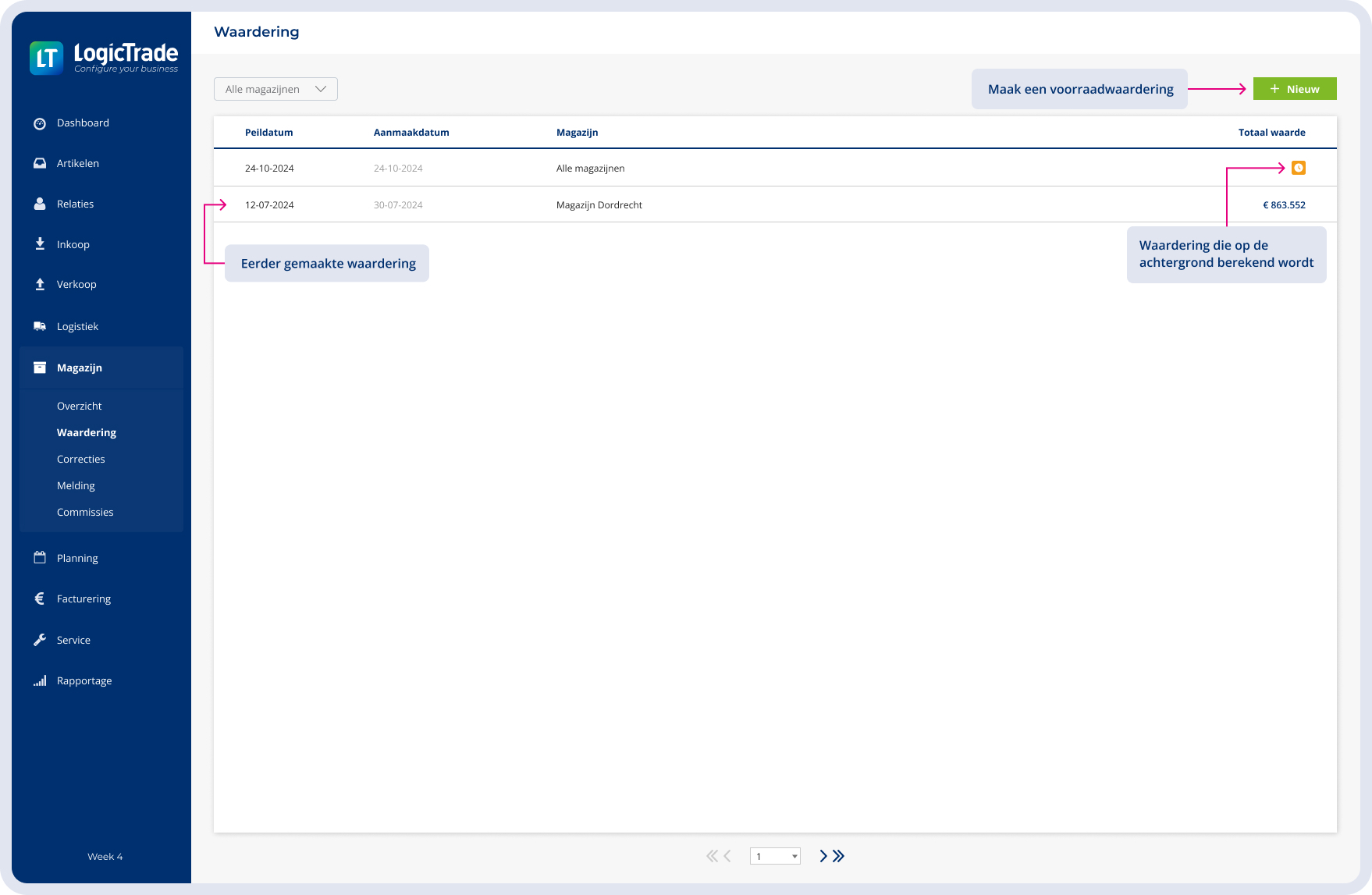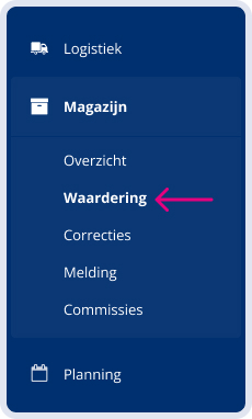 Deze nieuwe voorraadwaardering kan gevonden worden onder het menu Magazijn en heet Waarderingen.