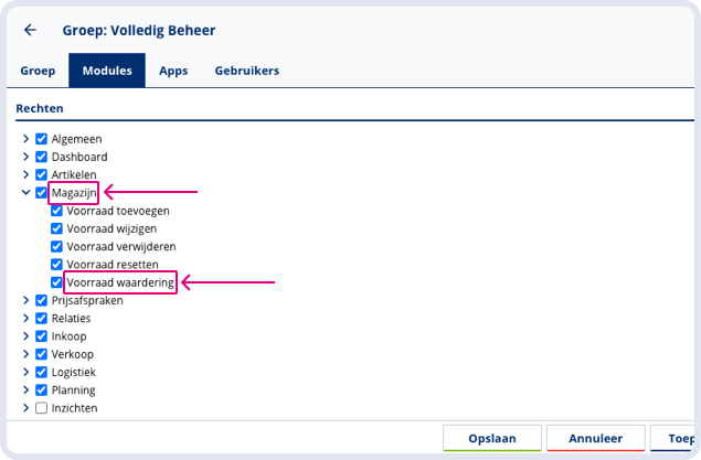 Om het menu zichtbaar te maken, zal je eerst de rechten aan moeten zetten in je beheeromgeving. Ga naar de rechtengroep Magazijn en zet Voorraadwaardering aan.